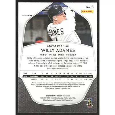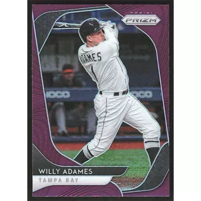 This is a 2020 Panini Prizm Purple Willy Adames baseball card. The card is #5 and pictures show condition.