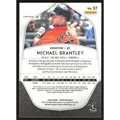 This is a 2020 Panini Prizm Purple Michael Brantley baseball card. The card is #57 and pictures show condition.