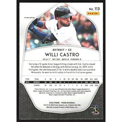 This is a 2020 Panini Prizm Red White and Blue Willi Castro baseball card. The card is #113 and pictures show condition. Team(s): Detroit Tigers Rookie Card (RC)