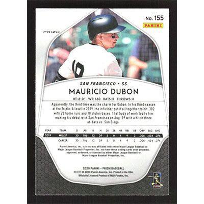 This is a 2020 Panini Prizm Red White and Blue Mauricio Dubon baseball card. The card is #155 and pictures show condition. Team(s): San Francisco Giants Rookie Card (RC)