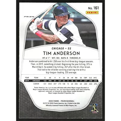 This is a 2020 Panini Prizm Red White and Blue Tim Anderson baseball card. The card is #161 and pictures show condition.
