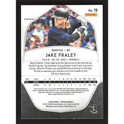 This is a 2020 Panini Prizm Red White and Blue Jake Fraley baseball card. The card is #19 and pictures show condition. Team(s): Seattle Mariners Rookie Card (RC)