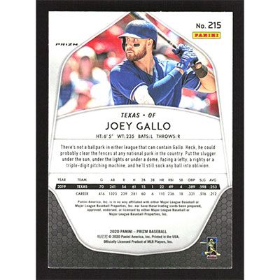 This is a 2020 Panini Prizm Red White and Blue Joey Gallo baseball card. The card is #215 and pictures show condition.