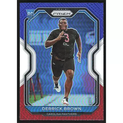 This is a 2020 Panini Prizm Red White and Blue Derrick Brown football card. The card is #365 and pictures show condition. Team(s): Carolina Panthers Rookie Card (RC)
