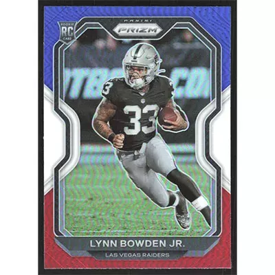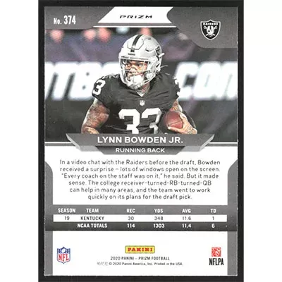 This is a 2020 Panini Prizm Red White and Blue Lynn Bowden Jr. football card. The card is #374 and pictures show condition. Team: Las Vegas Raiders Rookie Card