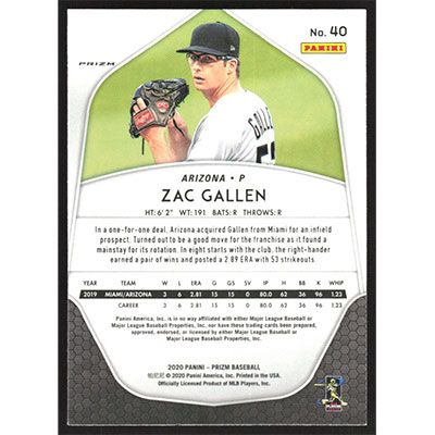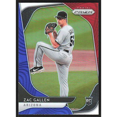 This is a 2020 Panini Prizm Red White and Blue Zac Gallen baseball card. The card is #40 and pictures show condition. Team(s): Arizona Diamondbacks Rookie Card (RC)