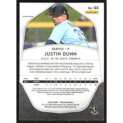This is a 2020 Panini Prizm Red White and Blue Justin Dunn baseball card. The card is #44 and pictures show condition. Team(s): Seattle Mariners Rookie Card (RC)