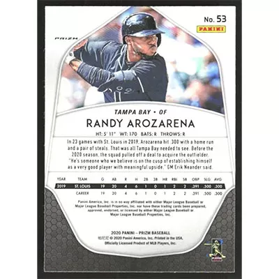 This is a 2020 Panini Prizm Red White and Blue Randy Arozarena baseball card. The card is #53 and pictures show condition. Team(s): Tampa Bay Rays Rookie Card (RC)
