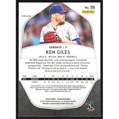 This is a 2020 Panini Prizm Red White and Blue Ken Giles baseball card. The card is #59 and pictures show condition.
