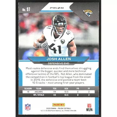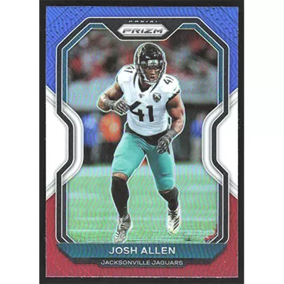 This is a 2020 Panini Prizm Red White and Blue Josh Allen football card. The card is #97 and pictures show condition.