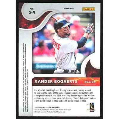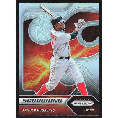 This is a 2020 Panini Prizm Scorching Silver Xander Bogaerts baseball card. The card is #S-4 and pictures show condition.