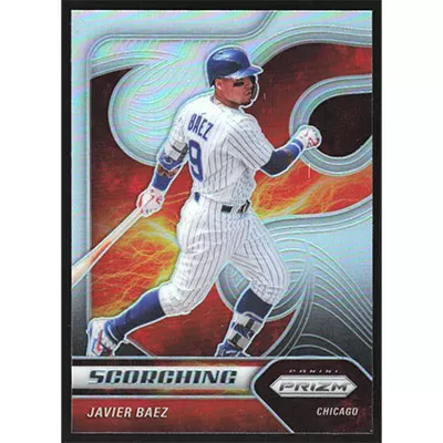This is a 2020 Panini Prizm Scorching Silver Javier Baez baseball card. The card is #S-9 and pictures show condition.