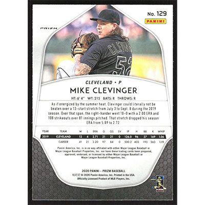 This is a 2020 Panini Prizm Silver Mike Clevinger baseball card. The card is #129 and pictures show condition.