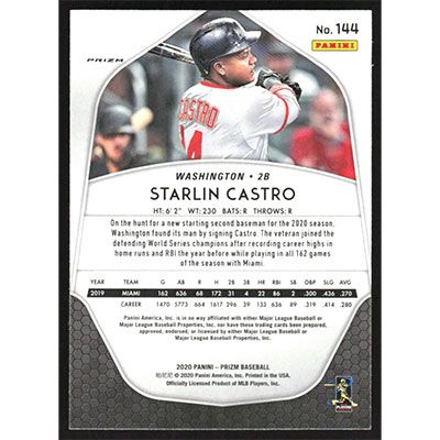 This is a 2020 Panini Prizm Silver Starlin Castro baseball card. The card is #144 and pictures show condition.