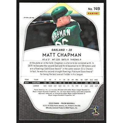 This is a 2020 Panini Prizm Silver Matt Chapman baseball card. The card is #149 and pictures show condition.