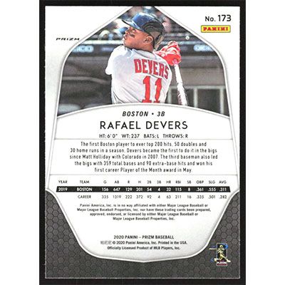 This is a 2020 Panini Prizm Silver Rafael Devers baseball card. The card is #173 and pictures show condition.