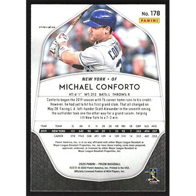 This is a 2020 Panini Prizm Silver Michael Conforto baseball card. The card is #178 and pictures show condition.
