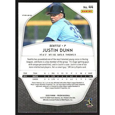 This is a 2020 Panini Prizm Silver Justin Dunn baseball card. The card is #44 and pictures show condition. Team(s): Seattle Mariners Rookie Card (RC)