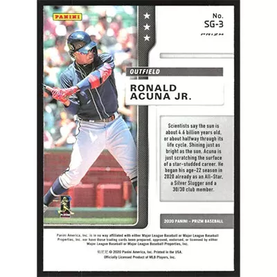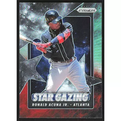 This is a 2020 Panini Prizm Star Gazing Cosmic Haze Ronald Acuña Jr. baseball card. The card is #SG-3 and pictures show condition. Team(s): Atlanta Braves