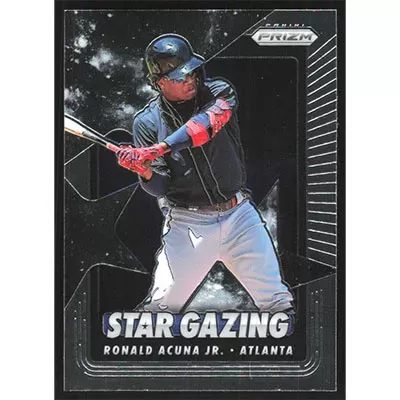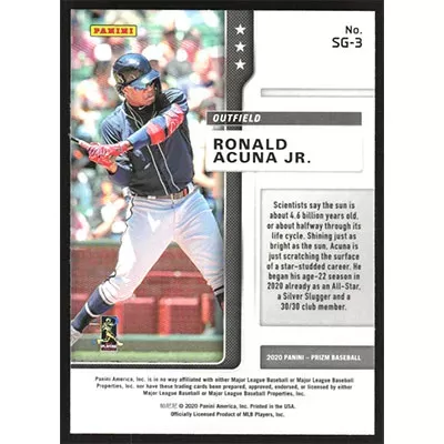 This is a 2020 Panini Prizm Star Gazing Ronald Acuña Jr. baseball card. The card is #SG-3 and pictures show condition.