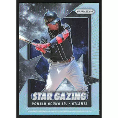 This is a 2020 Panini Prizm Star Gazing Silver Ronald Acuña Jr. baseball card. The card is #SG-3 and pictures show condition.