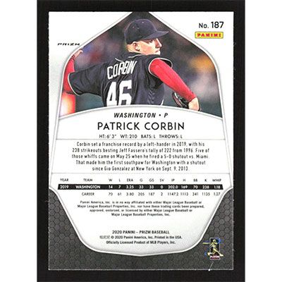 This is a 2020 Panini Prizm Teal Wave Patrick Corbin baseball card. The card is #187 and pictures show condition.