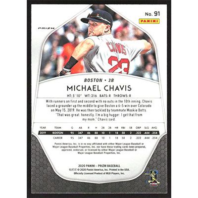 This is a 2020 Panini Prizm Teal Wave Michael Chavis baseball card. The card is #91 and pictures show condition.