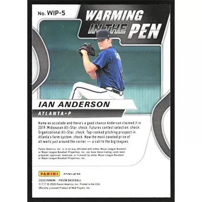 This is a 2020 Panini Prizm Warming in the Pen Silver Ian Anderson baseball card. The card is #WIP-5 and pictures show condition. Team(s): Atlanta Braves