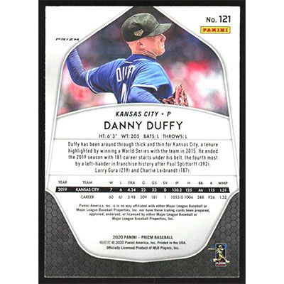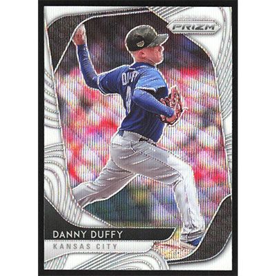 This is a 2020 Panini Prizm White Wave Danny Duffy baseball card. The card is #121 and pictures show condition.