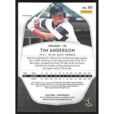 This is a 2020 Panini Prizm White Wave Tim Anderson baseball card. The card is #161 and pictures show condition.