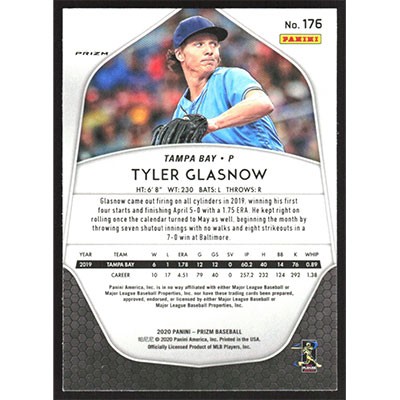 This is a 2020 Panini Prizm White Wave Tyler Glasnow baseball card. The card is #176 and pictures show condition.