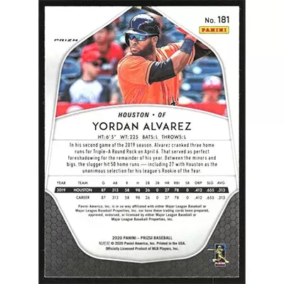 This is a 2020 Panini Prizm White Wave Yordan Alvarez baseball card. The card is #181 and pictures show condition. Team(s): Houston Astros Rookie Card (RC)