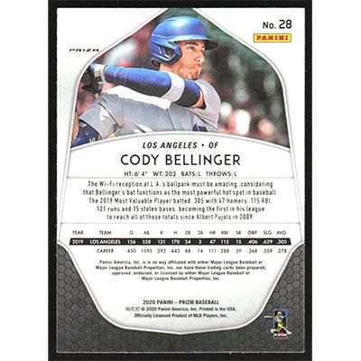 This is a 2020 Panini Prizm White Wave Cody Bellinger baseball card. The card is #28 and pictures show condition.