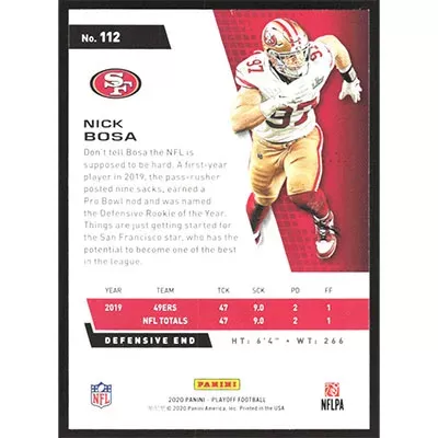 This is a 2020 Playoff Nick Bosa football card. The card is #112 and pictures show condition.
