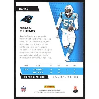 This is a 2020 Playoff Brian Burns football card. The card is #144 and pictures show condition.
