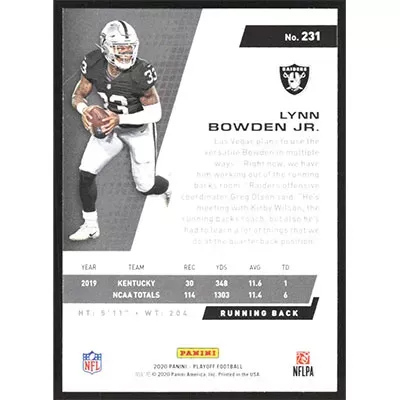 This is a 2020 Playoff Lynn Bowden Jr. football card. The card is #231 and pictures show condition.