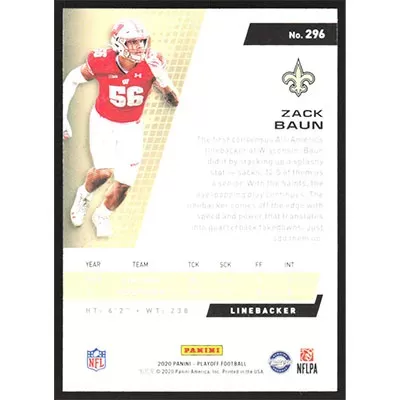 This is a 2020 Playoff Zack Baun football card. The card is #296 and pictures show condition.