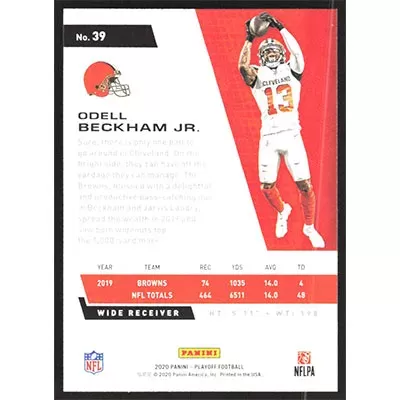 This is a 2020 Playoff Odell Beckham Jr. football card. The card is #39 and pictures show condition.