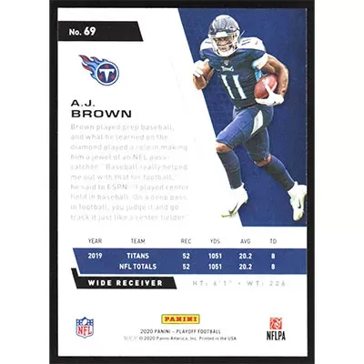 This is a 2020 Playoff A.J. Brown football card. The card is #69 and pictures show condition.