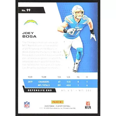 This is a 2020 Playoff Joey Bosa football card. The card is #99 and pictures show condition.