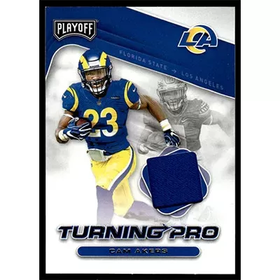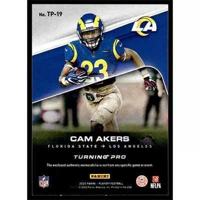 This is a 2020 Playoff Turning Pro Memorabilia Cam Akers Jersey football card. The card is #TP-19 and pictures show condition. Team: Los Angeles Rams Rookie Card