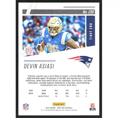 This is a 2020 Prestige Devin Asiasi football card. The card is #235 and pictures show condition.