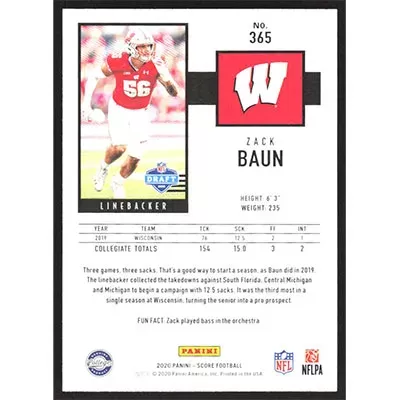 This is a 2020 Score Zack Baun football card. The card is #365 and pictures show condition.
