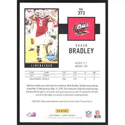 This is a 2020 Score Shaun Bradley football card. The card is #373 and pictures show condition.