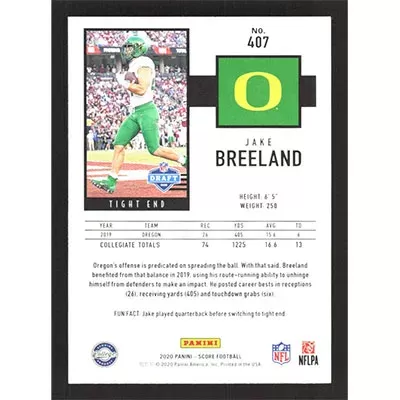 This is a 2020 Score Jake Breeland football card. The card is #407 and pictures show condition.