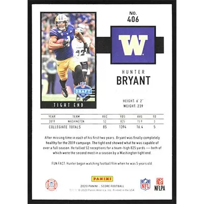 This is a 2020 Score Red Hunter Bryant football card. The card is #406 and pictures show condition.