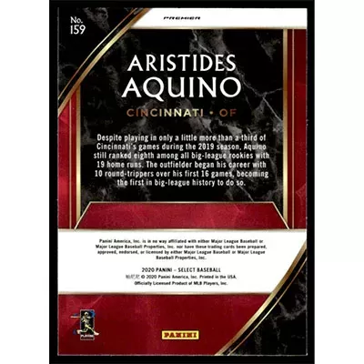 This is a 2020 Select Aristides Aquino Premier baseball card. The card is #159 and pictures show condition.
