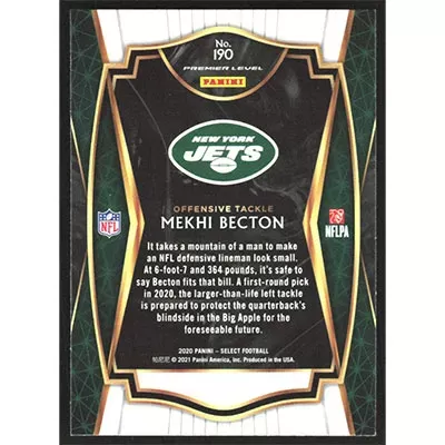 This is a 2020 Select Mekhi Becton football card. The card is #190 and pictures show condition.