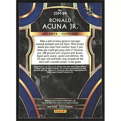 This is a 2020 Select 25-Man Ronald Acuña Jr. baseball card. The card is #25M-B4 and pictures show condition.