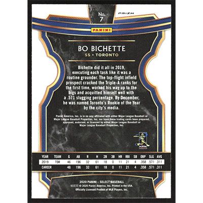 This is a 2020 Select Holo Bo Bichette baseball card. The card is #7 and pictures show condition.